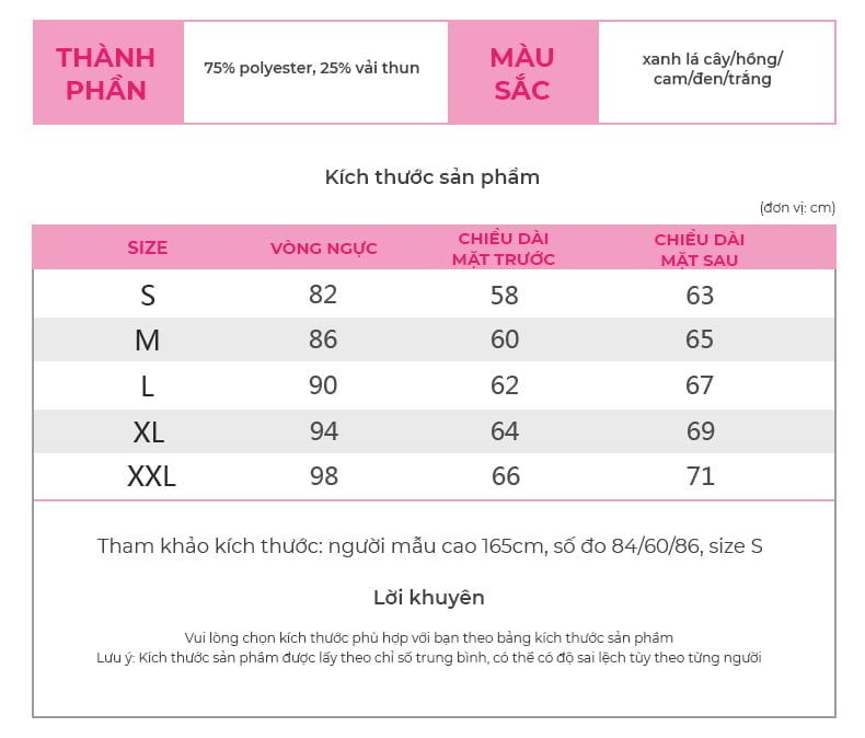 | Kích cỡ | S, M, L, XL, XXL |