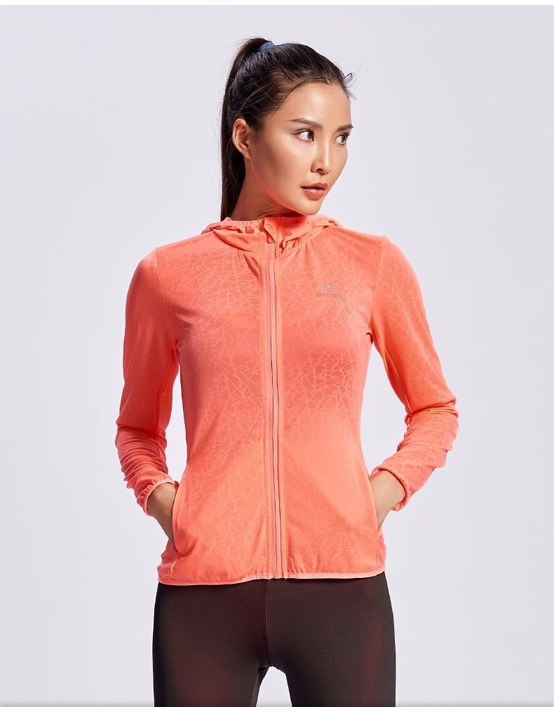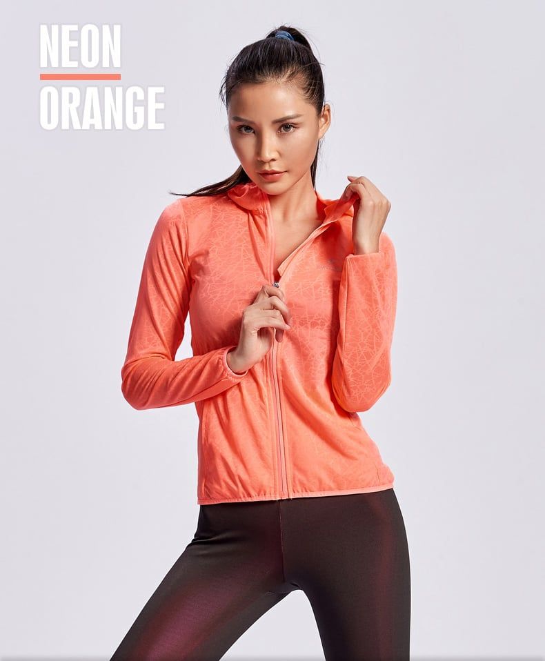 Áo khoác thể thao RunTiger 4080A - Màu cam với thiết kế thông minh giúp cơ thể trông thon gọn hơn. Áo có nón giúp chống nắng hiệu quả. Chất liệu vải Spandex co giãn giúp người mặc di chuyển thoải mái và linh hoạt.