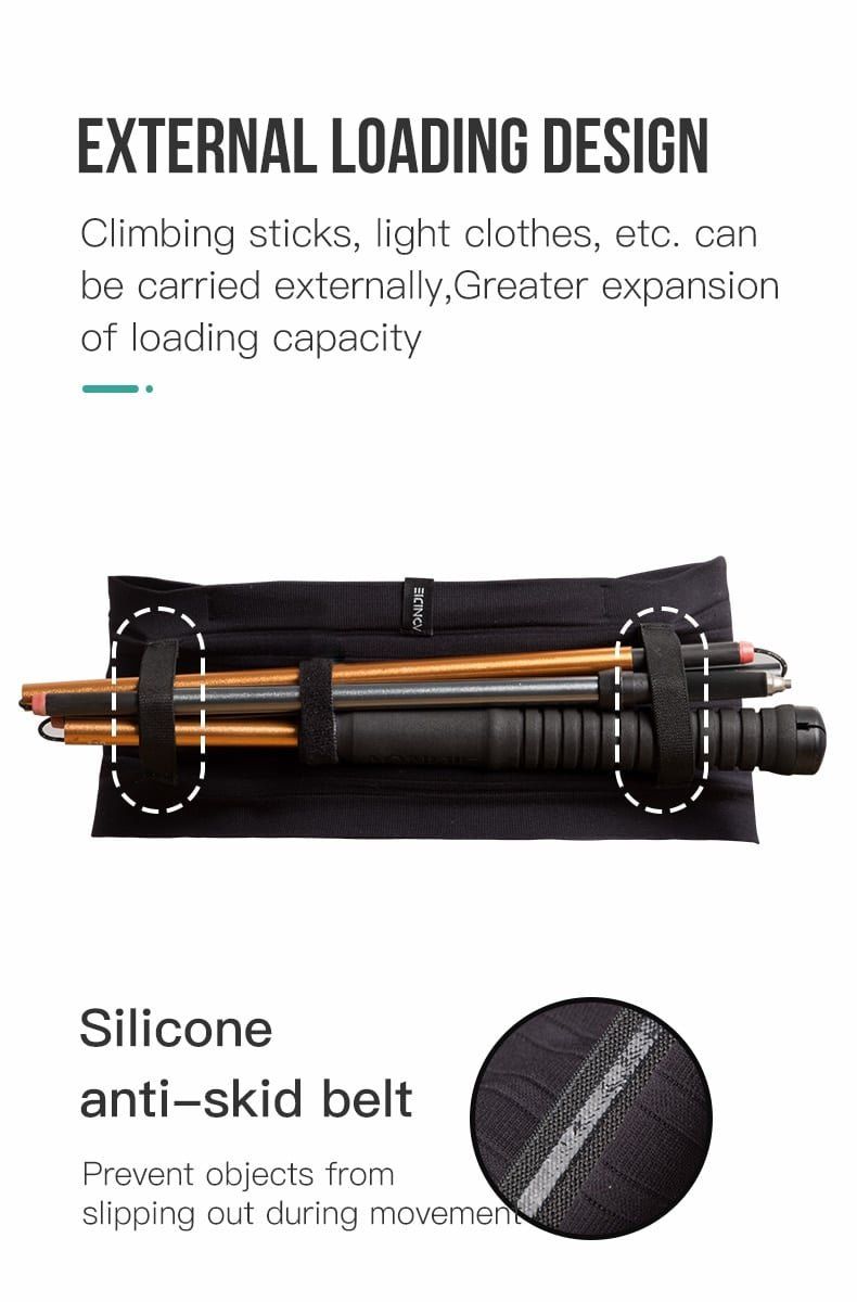 Một điểm đặc biệt của Aonijie W8116 là thiết kế chịu tải bên ngoài, giúp bạn dễ dàng mang theo gậy chạy bộ hoặc các phụ kiện cần thiết khi di chuyển đường dài.